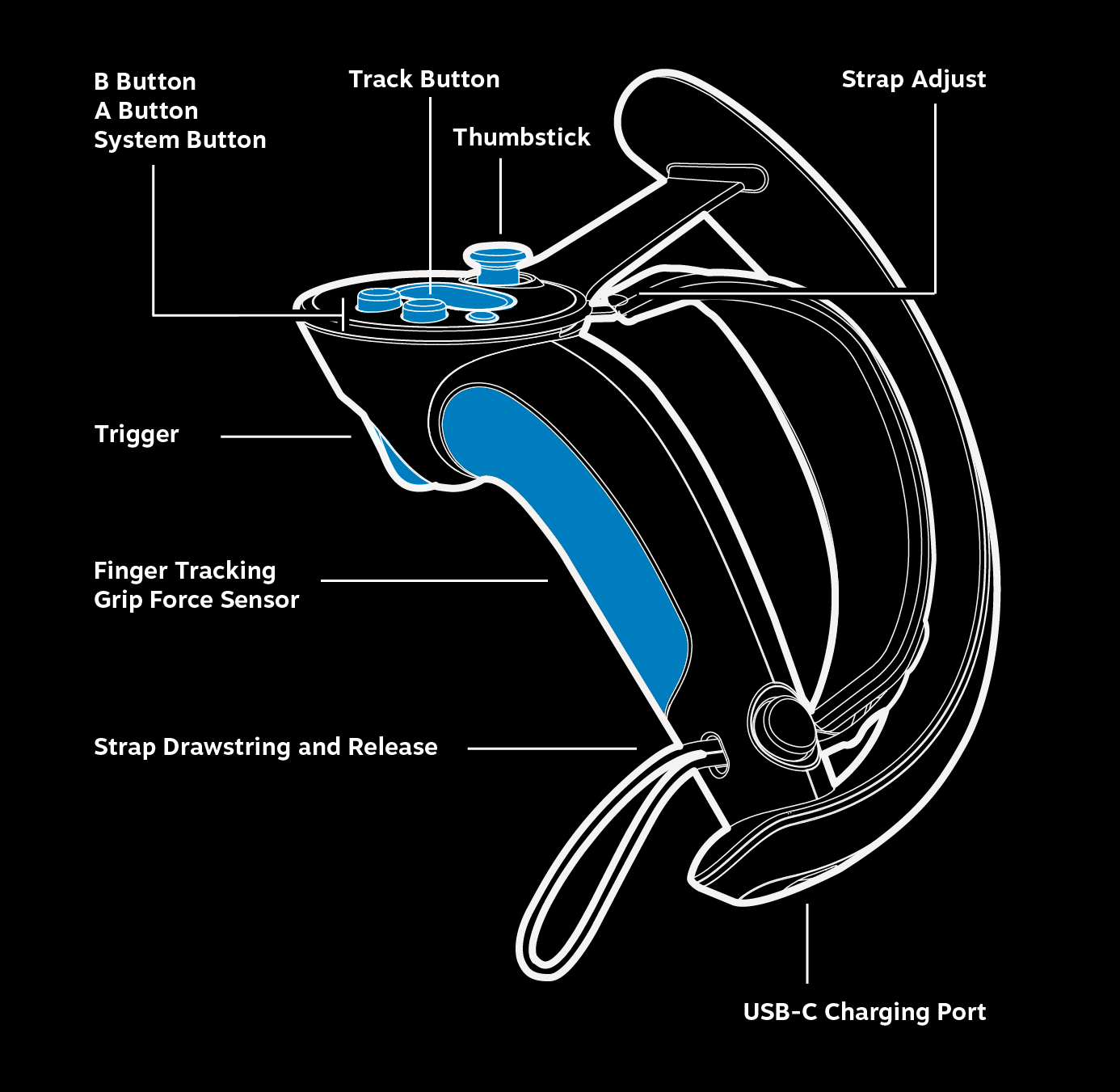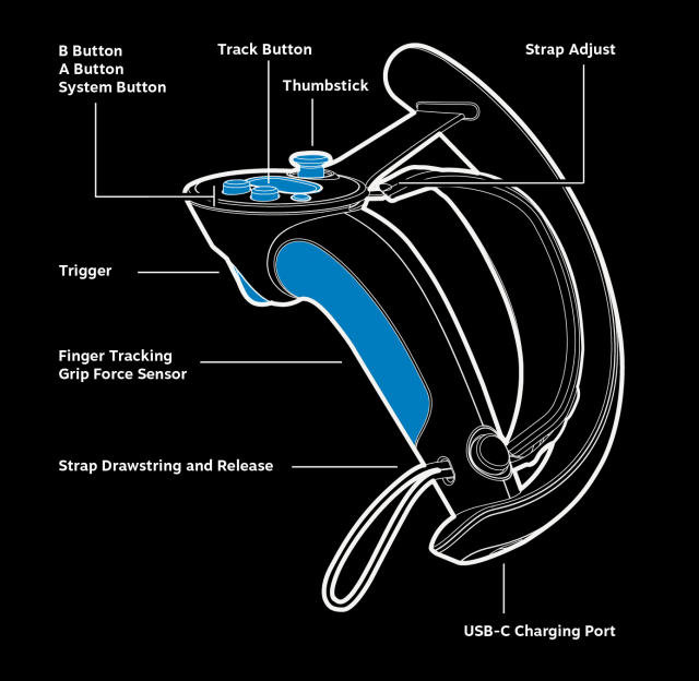 The track button also has a force sensor which, combined with haptics, can simulate the click of a button (whereas the original Vive controllers have a trackpad with an actual button click). The thumbstick and face buttons also have capacitive sensing, making it easy for the controller to know where the user’s fingers are at all times, and represent that information in the virtual world.