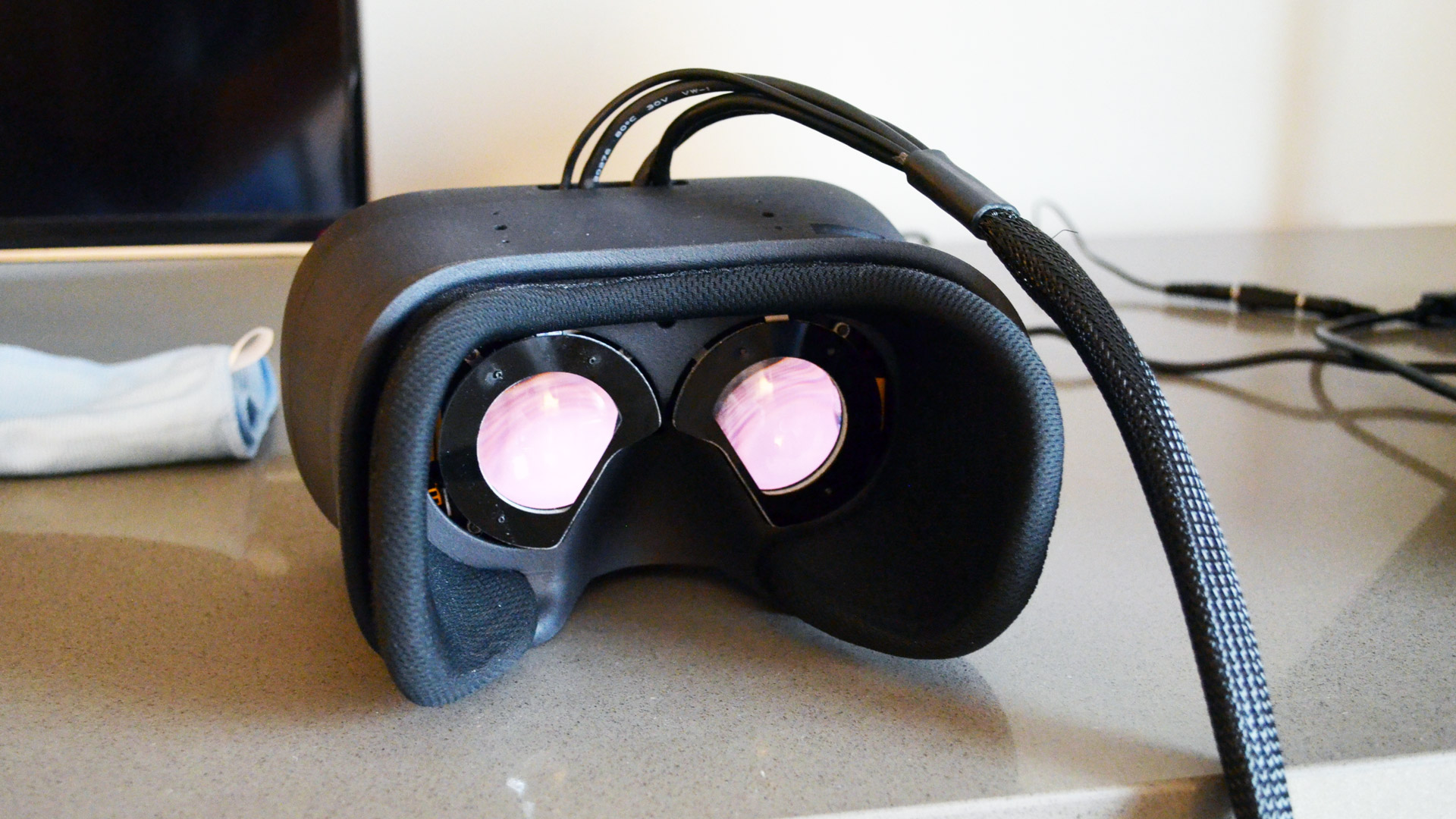 In the video above, keep your eye on the lower lines of the eye chart to get an idea of the difference in resolution between the focus display and the context display. The resolution jump is less noticeable here since the camera isn’t capturing the headset’s full field of view. You can’t quite see the boundary artifacts in this video.