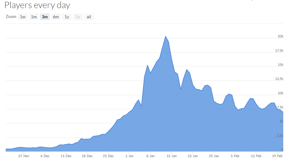 The daily user rate however has cooled to around to ~8,000 daily concurrents on the busiest say of the week—a far cry from the ~20,000 players at it height of popularity in mid-January—but a much more consistent usership overall. You can check out the publicly available breakdown on Steam DB.