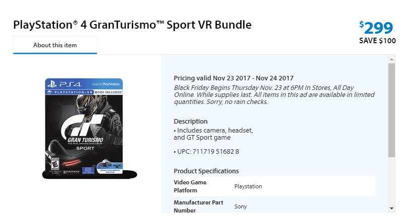 Playstation 4 GranTurismo Sport VR Bundle comes with a physical copy of the game, a PSVR headset, a PlayStation Camera, and an updated version of the PSVR demo disk with 13 different demos to play. This is a great bundle if you’re only looking to get into racing games and other games that don’t require the PS Move controllers. Otherwise, we’d suggest hitting up Target’s Black Friday Sale for a deal that offers $100 off any PSVR headsets, meaning you might just be able to get that PSVR ‘all in’ bundle for nearly as cheap.