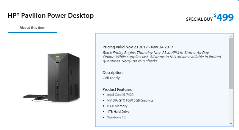 ‘VR Ready’ HP Pavilion Power Desktop – $500