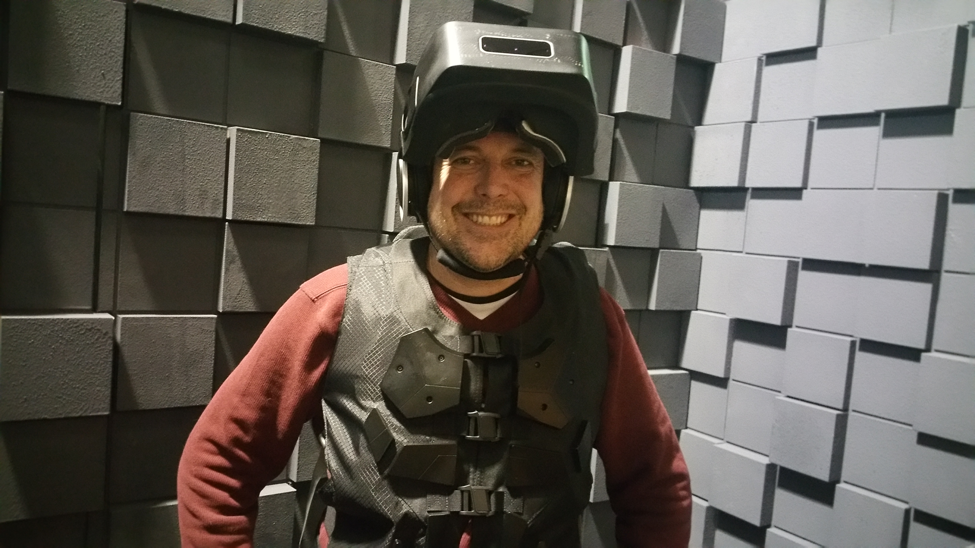 The “backtop”, the computer that drives the experience, continues to evolve and at this point feels lighter than my Sunday newspaper. Completely custom designed it is now running on par with an optimized home setup containing an Nvidia 980 which means that the graphics have been kicked up a notch since the last time I was out. The team is happy that the trade off between weight, size, power and performance is no longer a cause for concern. The demo scene was absolutely gorgeous running smoothly with all the bells and whistles Battery life is now at 1 hour and hot swappable ensuring no power outages during the experience. As soon as James strapped me in I took off sprinting through the warehouse jumping, dodging, and crouching. It felt so free and something that you don’t have to think about while in the experience.