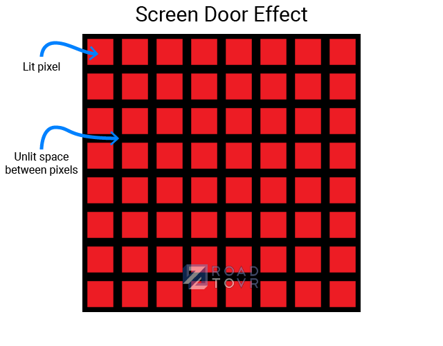 Pixels are small, individually lit elements laid out in an array to create a display. For various reasons, pixels are sometimes hard to pack tightly together, resulting in gaps between them which are unlit. A display’s ‘fill factor’ describes how much of the display’s area actually lights up vs. how much is unlit. The unlit spaces between the pixels, which are easy to see on displays with low fill factor, cause the appearance of the Screen Door Effect.
